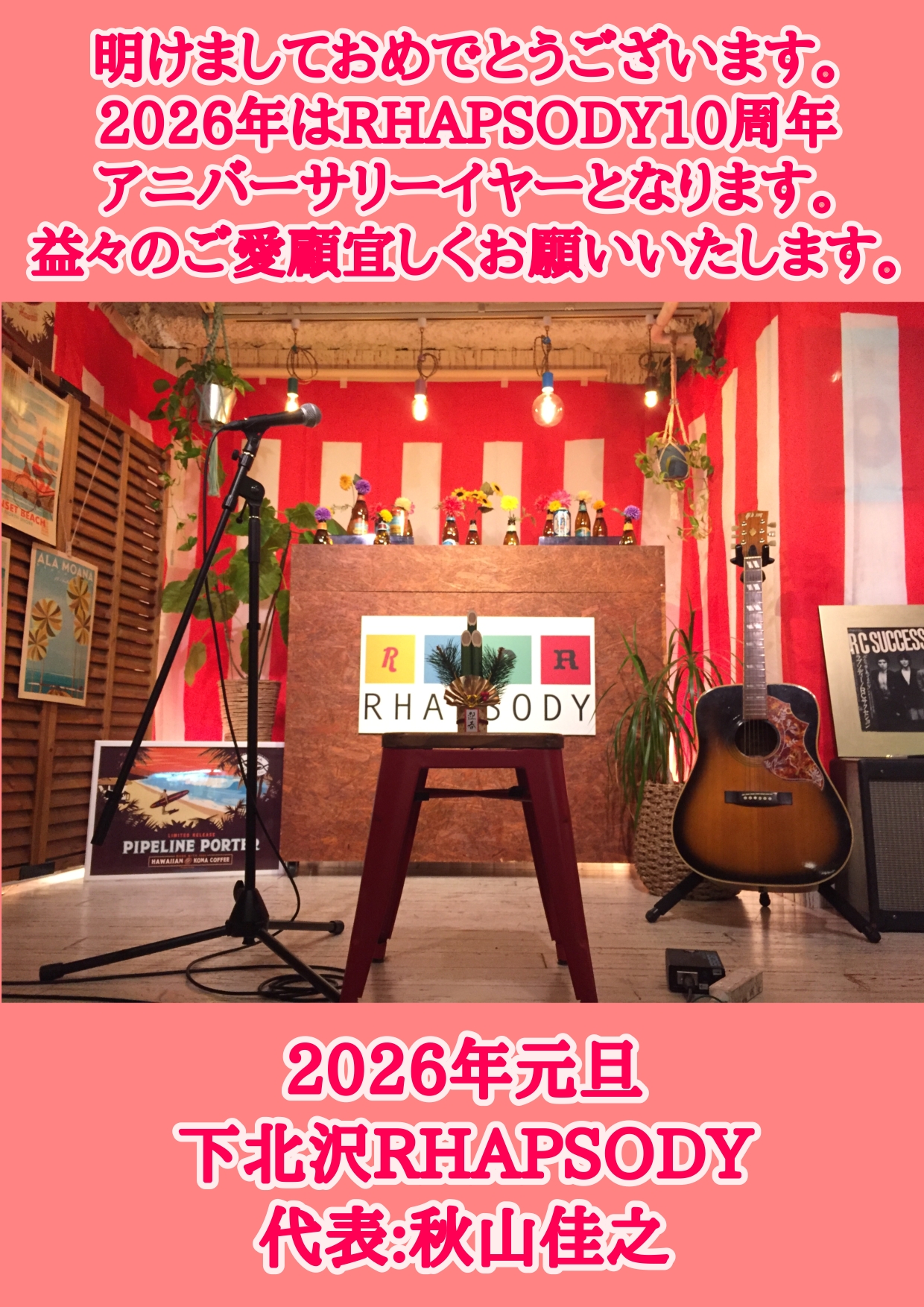01 Thu A HAPPY NEW YEAR 2026 ! 今年はRHAPSODY 10周年アニバーサリーイヤーとなります。 益々のご愛顧宜しくお願いいたします。 read more 06 Tue <20:00〜24:00 貸切り> read more 08 Thu 『あかりとまったりしよ〜❤️LIVE』 出演:芹沢あかり/ゲスト:??? OPEN 19:30/START 20:00 前売り/当日ともに¥2,000-(ドリンクはキャッシュにて承ります) ※チケット予約:出演者サイドにてご予約ください。 read more 09 Fri 『男たちの新年会ライブ !!!』 出演:加藤卓雄/イケダツカサ/鈴木ナオト OPEN 19:00/START 19:30 前売り¥3,000-/当日¥3,500-+別途¥1,000分drink券 ※チケット:各出演者サイドにてご予約ください。 read more 12 Mon [昼の部]<11:00〜14:30 貸切り> read more 12 Mon [夜の部]『ふたりスキップカウズとKENTARKSの新年会ライブ!』 出演:ふたりスキップカウズ(イマヤス & エンドウ)/KENTARKS(のむらけん) OPEN 18:00/START 18:30 前売り¥3,000-/当日¥3,500-+別途¥1,000分drink券 ※チケット:各出演者サイドにてご予約ください。 read more 16 Fri 『1年振り、高木フトシ × 三輪和也 新年の2マンライブ2026!!』 出演:高木フトシ/三輪和也 OPEN 19:00/START 19:30 前売り¥3,000-/当日¥3,500-+別途¥1,000分drink券 ※チケット予約:各出演者サイドにてご予約下さい。 read more 17 Sat 『正月の宴!』 出演:佐木伸誘/タキタム(滝和祥 & 田村直希)/松山弦大(aeronauts) OPEN 18:00/START 18:30 前売り¥3,000-/当日¥3,500-+別途¥1,000分drink券 ※チケット:各出演者サイドにてご予約ください。 read more 18 Sun [昼の部]『きみにさちあれ〜トークandアコースティックライブ2026』 出演:昭和残響オーケストラ OPEN 12:30/START 13:00 前売り¥4,500-/当日¥5,000-+別途¥1,000分drink券 ※チケット:出演者サイドにてご予約ください。 read more 19 Mon <13:00〜 貸切り> read more 23 Fri 『石岡美紀presents 僕の家へおいでよ〜My Homies!〜vol.8』 出演/石岡美紀(サポートギター:加藤卓雄)/吉野麻衣子(サポートギター:西里慶)/※セッションあり 前売り¥3,500-/当日¥4,000-+別途¥1,000分drink券 OPEN 19:00/START 19:30 ※チケット:各出演者サイドにてご予約ください。 read more 24 Sat [昼の部]『(コーヒー飲みながら漫才見るイベント)〜第23回マンザ喫茶』 出演:ワンワンニャンニャン/ゲスト店員:豊田耕造 OPEN & START 11:00〜(13:30閉店) 前売り/当日ともに¥2,000-(コーヒー付き) ※ info:問い合わせは、X(@wannyankikuchi)にコメントまたはDMお願いします。 read more 24 Sat [夜の部]『新春!阿部桃子 弾き語りワンマンライブ!』 出演:阿部桃子 OPEN 18:00/START 18:30 前売り¥3,000-/当日¥3,500-+別途¥1,000分drink券 ※チケット:出演者サイドにてご予約ください。 read more 25 Sun [昼の部]<10:00〜15:00 貸切り> read more 25 Sun [夜の部]『カネヤン、ガーラ、健ちゃんの、楽しい新年会』 出演:菅原龍平/佐々木健太郎(アナログフィッシュ)/金戸覚 OPEN 18:00/START 18:30 前売り¥3,500-/当日¥4,000-+別途¥1,000分drink券 ※チケット:詳しくは read more にてご確認ください。 read more 27 Tue 『滝と薫の歌ってみるでSHOW ! ! 〜今年もよろしくお願いします!〜第3回タスク 新春 呑めや唄えや!の巻』 出演:滝和祥/野口薫/ゲスト:新宿心音会板谷祐 OPEN 19:00/START 19:30 前売り¥3,000-/当日¥3,500-+別途¥1,000分drink券 ※チケット予約:各出演者サイドにてご予約下さい。 read more 28 Wed 『歌うたいたちの新春ナイト!!』 出演:ジョウミチヲ/大森洋平/大久保海太 OPEN 19:00/START 19:30 前売り¥3,000-/当日¥3,500-+別途¥1,000分drink券 ※チケット:各出演者サイドにてご予約ください。 read more 30 Fri 『不定期平日営業、ペンション中尾8号棟〜約半年ぶり営業・2026新春編〜[オールリクエストライブ!]』チケット予約の際にリクエスト曲を書いてご予約ください。(一日マスター中尾より:『すべてのリクエストには応えられないかもだけど、なるべく応えたいっ』と思ってますので、どしどしリクエストください!) 出演:中尾諭介(In the Soup) OPEN 18:30/START 19:00 前売り¥3,000-/当日¥3,500-+別途¥1,000分drink券 ※チケット予約:inthesoup.nakao@gmail.com にて、リクエスト曲も書いてご予約ください。 read more 31 Sat 『俺たちの、正月最後の日の新年会!』 出演:TARSHI/ウラキユズル/イノウエヒロミチ OPEN 18:00/START 18:30 前売り¥3,000-/当日¥3,500-+別途¥1,000分drink券 ※チケット:各出演者サイドにてご予約ください。 read more