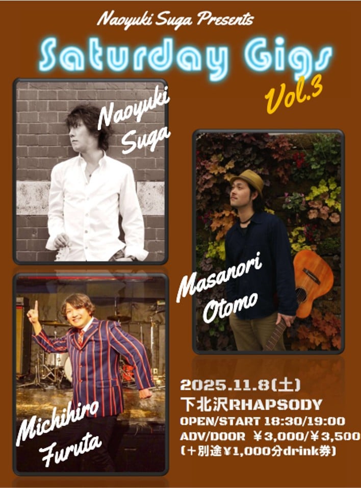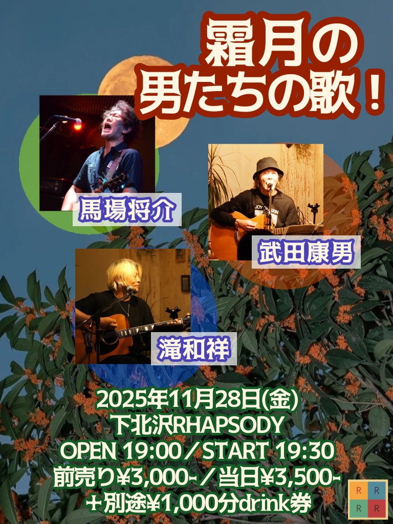 01 Sat 『(コーヒー飲みながら漫才見るイベント)〜第20回マンザ喫茶〜祝20回記念 & ワンワン生誕祭〜』 出演:ワンワンニャンニャン/ゲスト店員:豊田耕造 OPEN & START 18:00〜(21:00閉店) 前売り/当日ともに¥2,000-(コーヒー付き) ※ info:問い合わせは、X(@wannyankikuchi)にコメントまたはDMお願いします。 read more 03 Mon 『ご無沙汰!吉田一休 × GONDA 2マンライブ! 』 出演:吉田一休/GONDA OPEN 19:00/START 19:30 前売り¥3,500-/当日¥4,000-+別途¥1,000分drink券 ※チケット:詳しくは read more にてご確認ください。 read more 08 Sat 『菅直行presents〜”Saturday Gigs” vol.3』 出演:菅直行/大友マサノリ/古田ミチヒロ OPEN 18:30/START 19:00 前売り¥3,000-/当日¥3,500-+別途¥1,000分drink券 ※チケット予約:各出演者サイドにてご予約下さい。 read more 16 Sun 『こんにちは、ただいま、はじめまして 2025』 出演:くわばらかずひろ OPEN 18:00/START 18:30 前売り、当日共に¥2,000-+別途¥1,000分drink券 ※チケット:出演者サイドにて御予約下さい。 read more 18 Tue 『滝と薫の歌ってみるでSHOW ! ! 〜第2回イケダツカサ大いに歌うの巻!』 出演:滝和祥/野口薫/ゲスト:イケダツカサ OPEN 19:00/START 19:30 前売り¥3,000-/当日¥3,500-+別途¥1,000分drink券 ※チケット予約:各出演者サイドにてご予約下さい。 read more 23 Sun 『白いベランダと、夕暮れカフェ』 出演:白いベランダ/お菓子:asa/珈琲:うねり OPEN 15:00/START 15:30 料金 ¥3,700-(焼き菓子、珈琲付き) ※チケット:出演者サイドにてご予約ください。 read more 27 Thu 『こはみんの、平日の夜の2マンショー vol.12』<配信あり> 出演:小浜田知子/Mont.Barbara OPEN 19:00/START 19:30 前売り¥2,500-/当日¥3,000-+別途¥1,000分drink券/配信チケット:¥2,500-(他、応援価格もあり) ※チケット:詳しくは read more にてご確認ください。 read more 28 Fri 『霜月の男たちの歌! 』 出演:馬場将介/武田康男/滝和祥 OPEN 19:00/START 19:30 前売り¥3,000-/当日¥3,500-+別途¥1,000分drink券 ※チケット:各出演者サイドにてご予約ください。 read more 29 Sat 『きゃめるーがるー vol.2~狼とラクダのTEA PARTY~』 出演:きゃめる/Loup-garou OPEN 12:30/START 13:00 前売り¥3,500-/当日¥4,000-(¥1,000分drink券込) ※チケット予約:各出演者にご連絡いただくか、loup.garou.2011@gmail.com までご連絡ください。 ※未就学児入場可(膝上鑑賞の場合チケット不要) read more 30 Sun 『タマシイとナオキ屋のROcK魂手箱 東京編』 出演:ナオキ屋/當山貴史(ShaolongToTheSky) OPEN 18:30/START 19:00 前売り¥2,500-/当日¥3,000-+別途¥1,000分drink券 ※チケット:各出演者サイドにてご予約ください。 read more