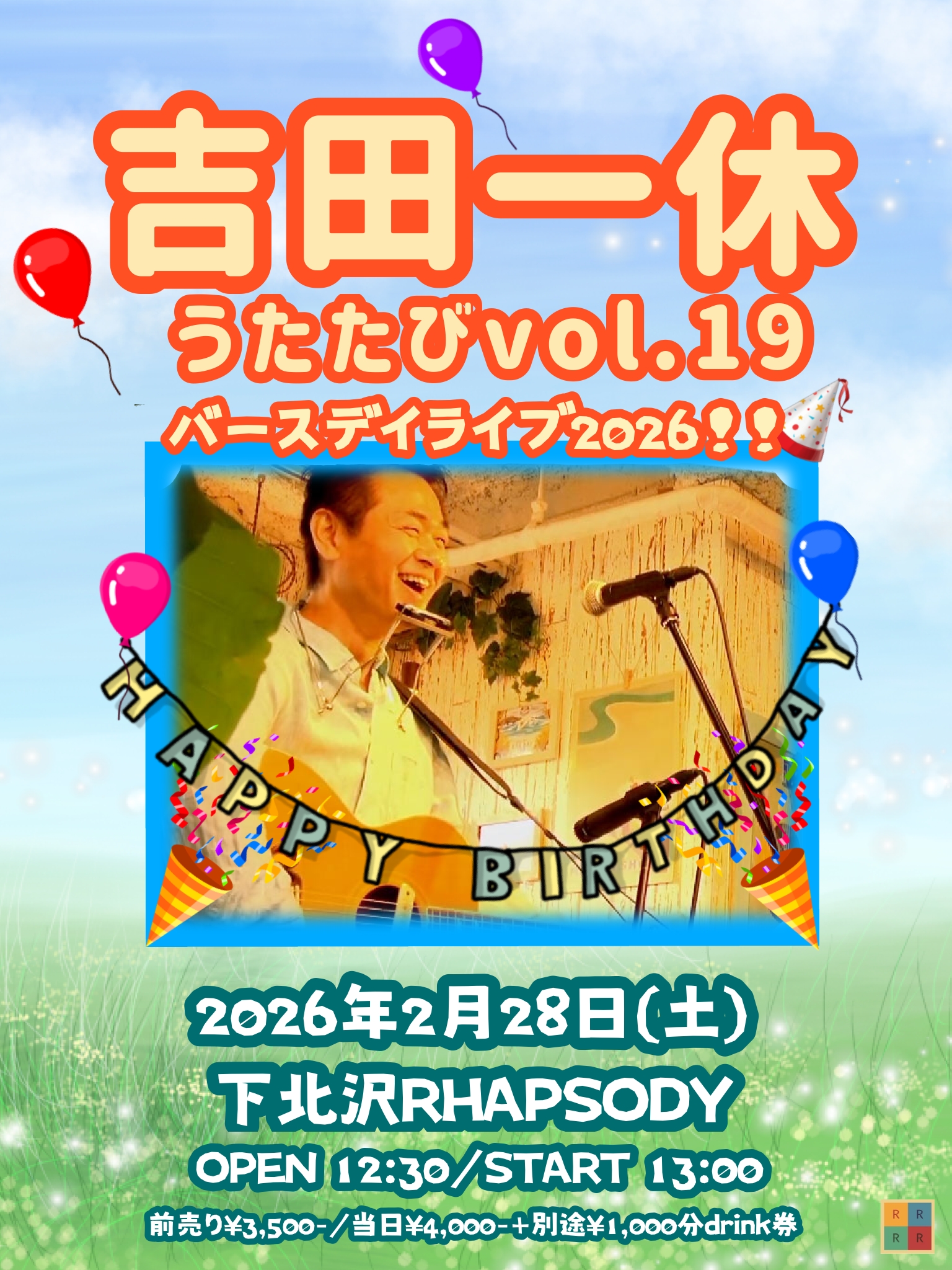 01 Sun [昼の部]<11:00〜15:00 貸切り> read more 01 Sun [夜の部]『仲良しライブ〜2026年もよろしくお願いしますの巻』 出演:ふたりスキップカウズ(イマヤス & エンドウ)/鈴木純也 OPEN 18:00(※プレミアム会員は17:45から入場できます)/START 18:30 前売り¥3,000-/当日¥3,500-+別途¥1,000分drink券 ※チケット予約:各出演者サイドにてご予約ください。 read more 24 Tue 『滝と薫の歌ってみるでSHOW ! ! 〜ゲスト:TETSU(from F.O.A)の巻』 出演:滝和祥/野口薫/ゲスト:TETSU(from F.O.A) OPEN 19:00/START 19:30 前売り¥3,000-/当日¥3,500-+別途¥1,000分drink券 ※チケット予約:各出演者サイドにてご予約下さい。 read more 28 Sat [昼の部]『うたたび vol.19〜バースデイライブ2026!!』 出演:吉田一休(DOMINGOS) OPEN 12:30/START 13:00 前売り¥3,500-/当日¥4,000-+別途¥1,000分drink券 ※チケット:詳しくは read more にてご確認ください。 read more
