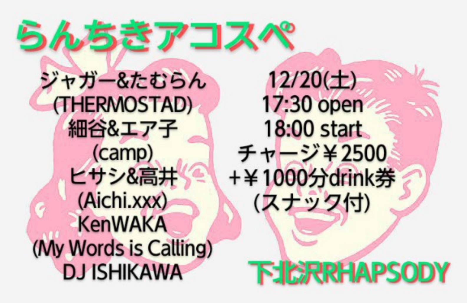 出演:ジャガー&たむらん(THERMOSTAD)/細谷&エア子(camp)/ヒサシ&高井(Aichi.xxx)/KenWAKA(My Words is Calling)/DJ:ISHIKAWA -